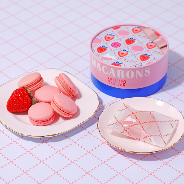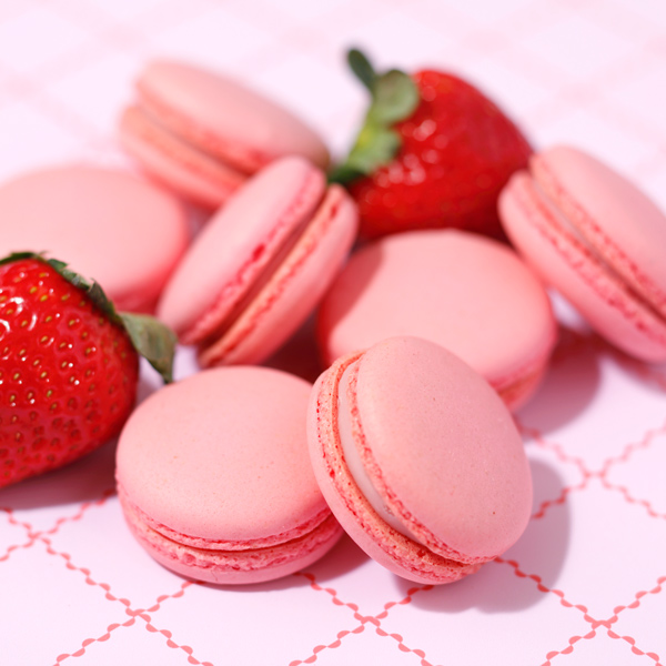 メレンゲに砂糖、アーモンドプードル、福岡県産あまおう苺のピューレを加えた生地を焼き上げ、あまおう苺ピューレとバニラビーンズ入りのバニラペーストを合わせたクリームをサンドしました。