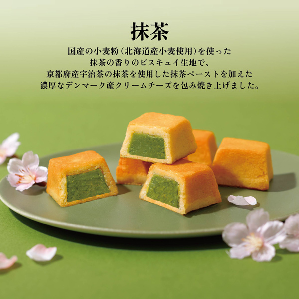 国産の⼩⻨粉(北海道産⼩⻨使⽤)を使った抹茶の⾹りのビスキュイ⽣地で、京都府産宇治茶の抹茶を使⽤した抹茶ペーストを加えた濃厚なデンマーク産クリームチーズを包み焼き上げました。