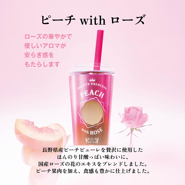 ⻑野県産ピーチピューレを贅沢に使⽤したほんのり⽢酸っぱい味わいに、国産ローズの花のエキスをブレンドしました。ピーチ果⾁を加え、⾷感も豊かに仕上げました。