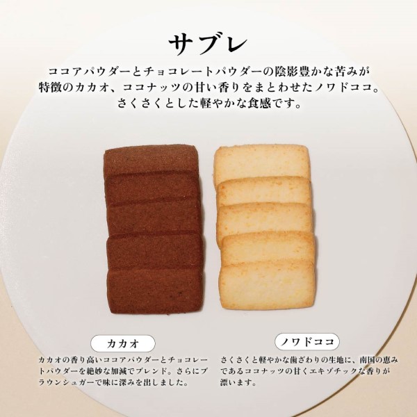 ココアパウダーとチョコレートパウダーの陰影豊かな苦みが特徴のカカオ、 ココナッツの甘い香りをまとわせたノワドココ。さくさくとした軽やかな食感です。