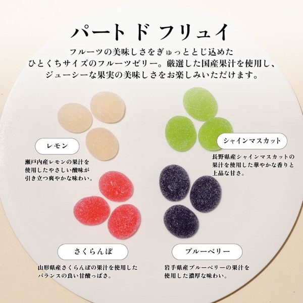 フルーツの美味しさをぎゅっととじ込めたパート ド フリュイ。厳選した国産果汁を使用し、ジューシーな果実の美味しさをお楽しみいただけます。キラキラと輝く美しいひと粒を個包装しました。