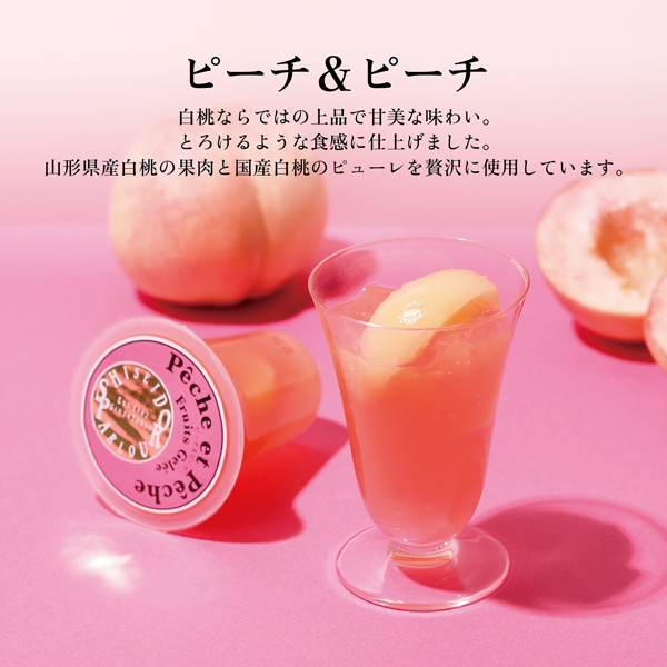 白桃ならではの上品で甘美な味わい。とろけるような食感に仕上げました。山形県産白桃の果肉と国産白桃のピューレを贅沢に使用しています。