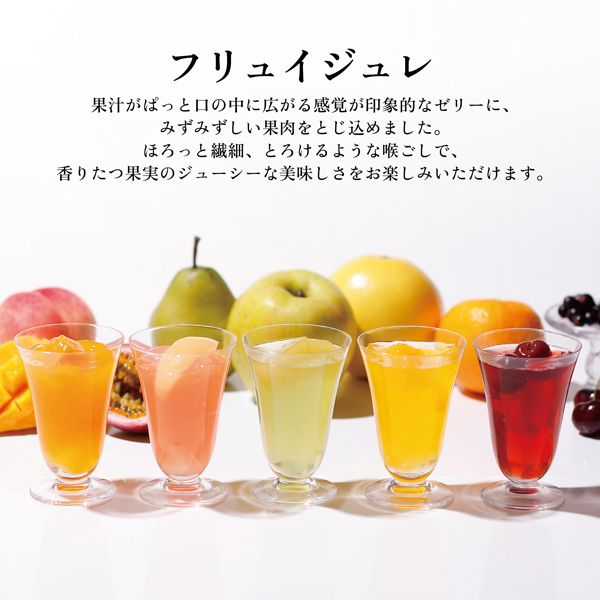 ほろっと繊細、とろけるような喉ごしで、香りたつ果実のジューシーな美味しさをお楽しみいただけます。