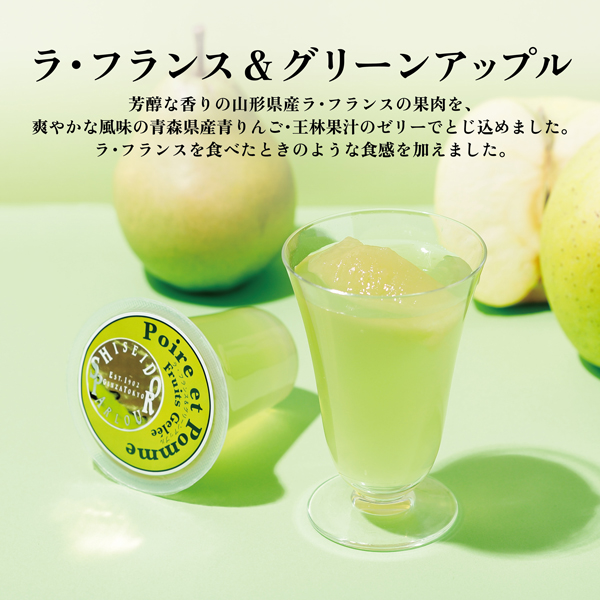 芳醇な香りの山形県産ラ・フランスの果肉を、爽やかな⾵味の⻘森県産⻘りんご・王林果汁のゼリーでとじ込めました。ラ・フランスを食べたときのような食感を加えました。