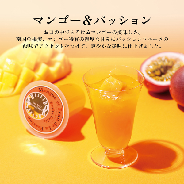 お口の中でとろけるマンゴーの美味しさ。南国の果実、マンゴー特有の濃厚な甘みにパッションフルーツの酸味でアクセントをつけて、爽やかな後味に仕上げました。