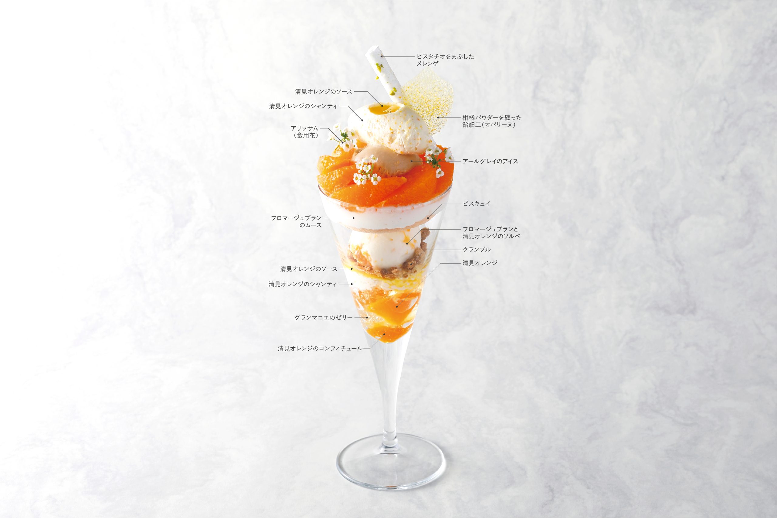 愛媛県産清見オレンジのジューシーな甘味とフロマージュブランを合わせ、アールグレイの華やかな香りを添えた春らしいパフェです。トップにのせた清見オレンジのクリームの中心には柑橘ソースをしのばせています。トロリとした食感とともにお楽しみください。